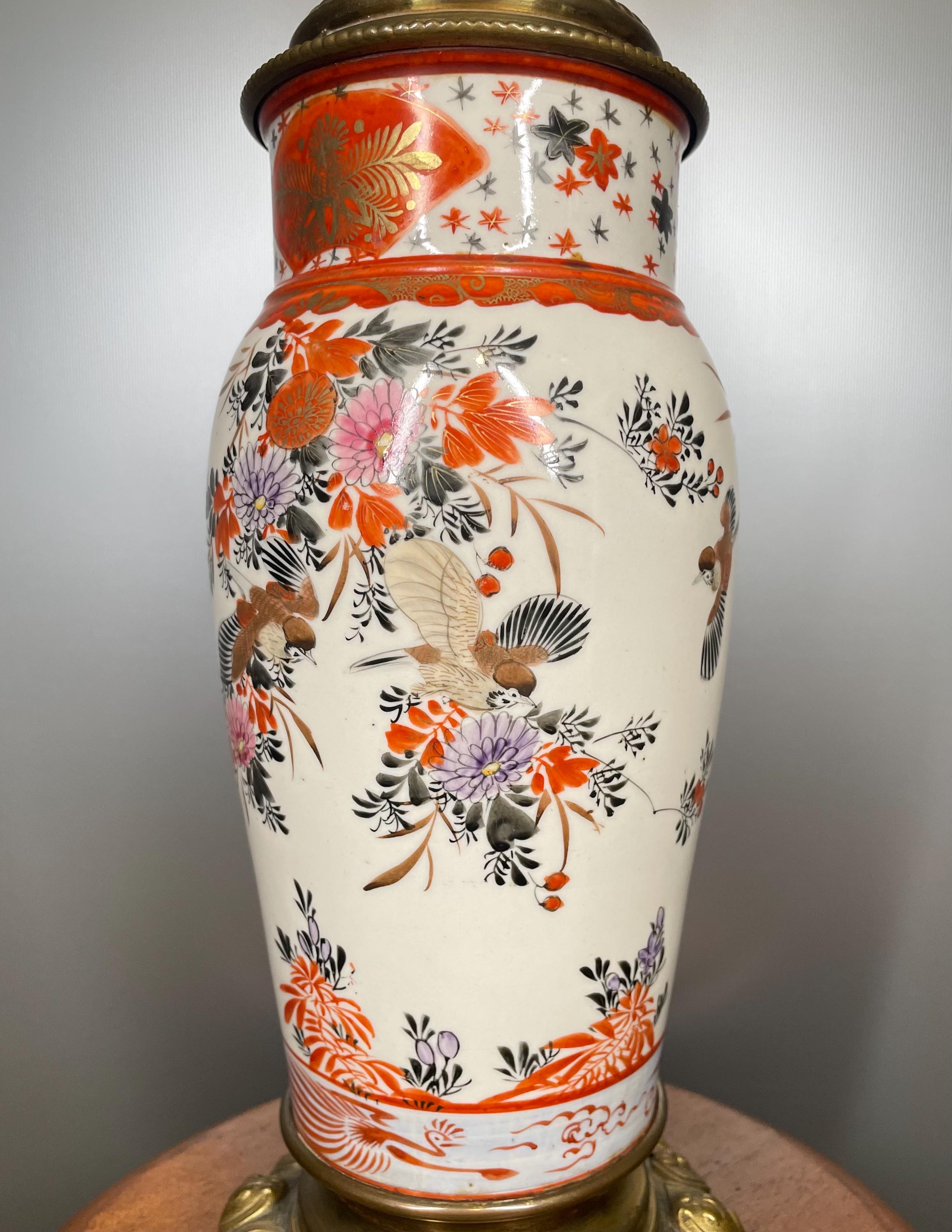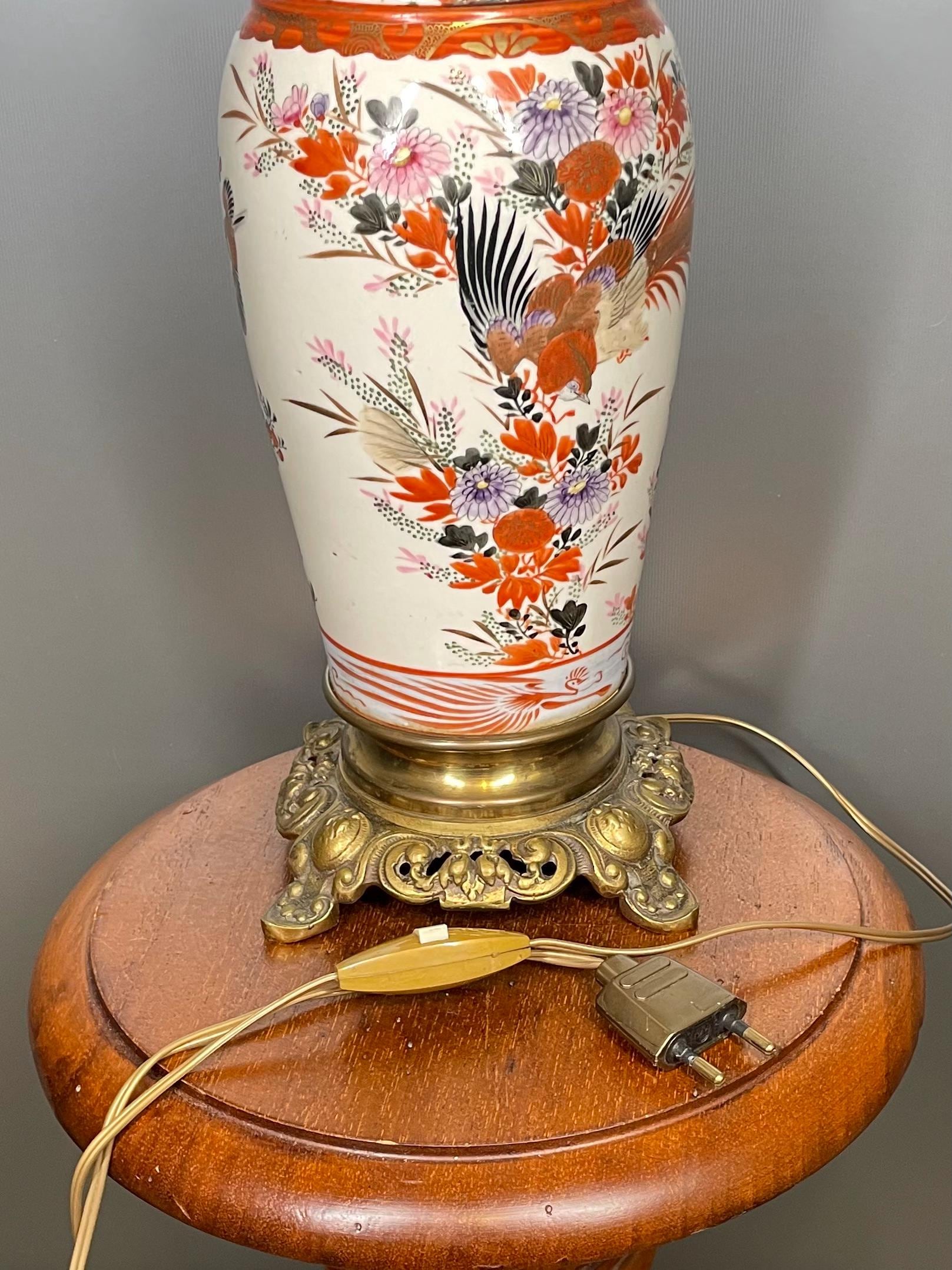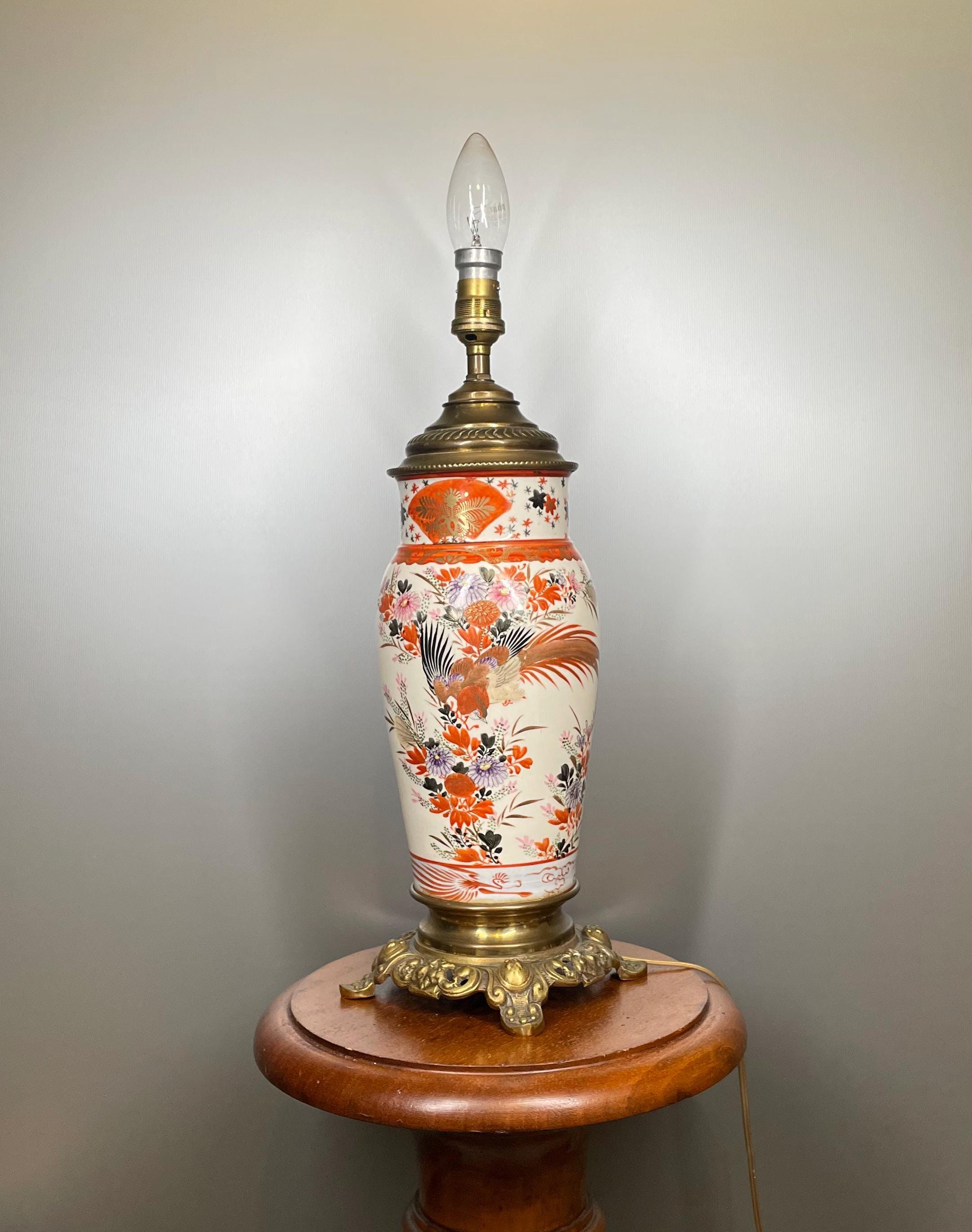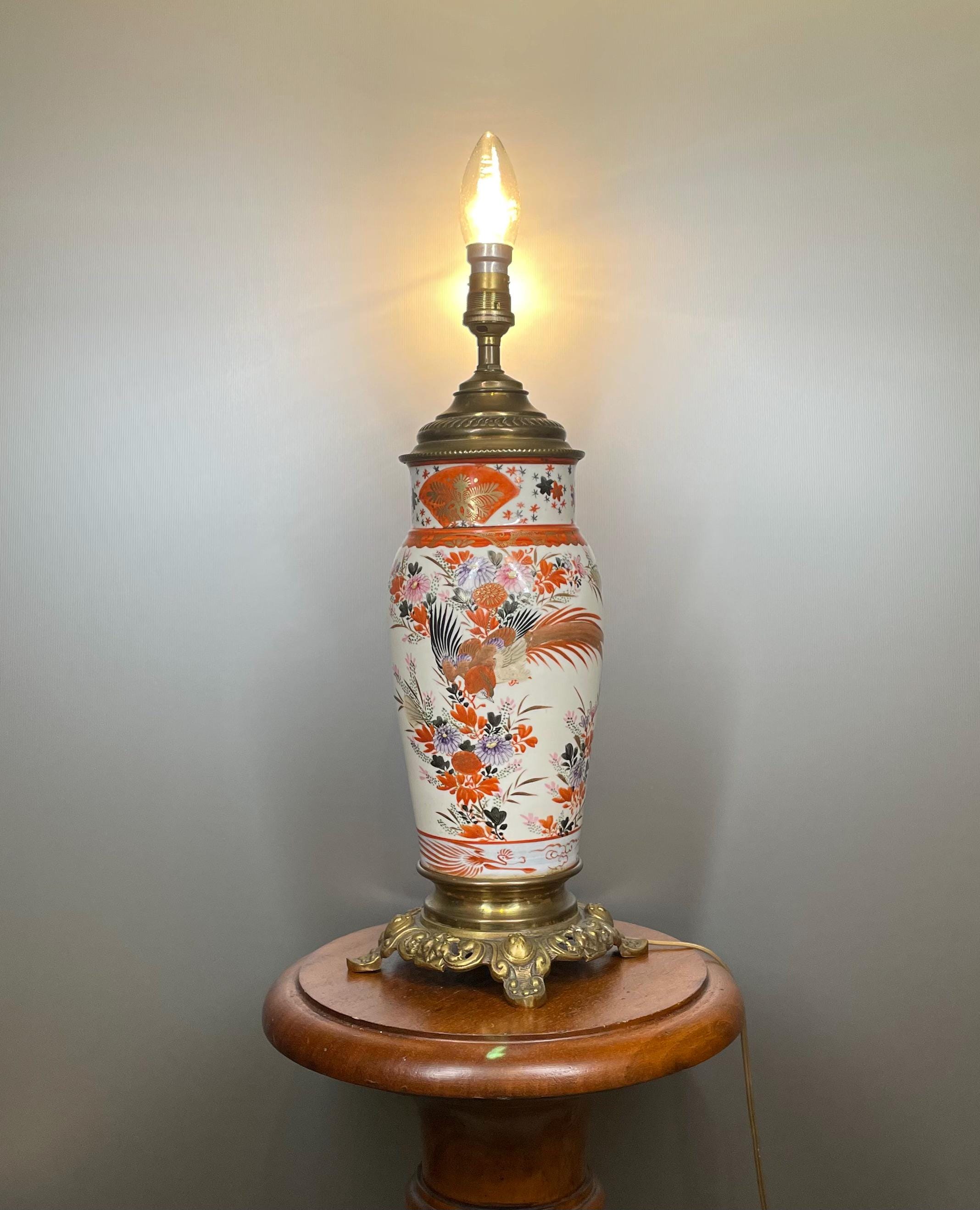 Antique Japanese Arita lamp, Imari style, 40 cm, late 19th century. Hand-painted porcelain with lyrebird and flower decoration. Gilt bronze. Rare and numbered.